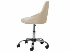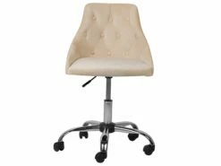 Dieses praktische Modell besticht mit seinem angenehmen Samtstoff-Bezug in Beige, der mit robuster Versteppung und eleganten Knöpfen im Retro Look bestückt ist. Die äußerst bequeme Sitzfläche befindet sich auf einem stabilen Kreuzfuß mit Rollen, so können Sie den Stuhl jederzeit überall dorthin verschieben, wo er gebraucht wird. Benutzen Sie den zusätzlichen Hebel, um die Sitzhöhe je nach Wunsch zu verstellen und eine entsprechende Sitzposition am Schreibtisch zu erreichen.
