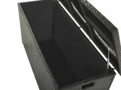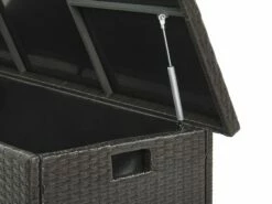 Unsere Kissenbox bietet viel Stauraum und schützt Ihre Kissen, Decken und Polster vor Regen und Sonne. Dank der zwei praktischen Griffe an den Seiten ist die Gartentruhe leicht zu transportieren. Der aus Polyrattan gefertigte Deckel lässt sich mittels zwei Gasdruckfedern spielend leicht öffnen und schließen. Eine schwarze Innenhülle verhindert das Eindringen von Schmutz und Insekten. Die einteilige Innenhülle wird mit einem starken Klettverschluss befestigt und hat somit optimalen Halt und kann bei Bedarf ausgewechselt oder gewaschen werden. Bitte beachten Sie, dass bei starken und andauernden Regenfällen die Box bedeckt werden sollte, damit sich das Wasser auf dem Deckel nicht ansammelt und ins Innere der Truhe eindringt.