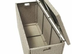 Unsere Kissenbox bietet viel Stauraum und schützt Ihre Kissen, Decken und Polster vor Regen und Sonne. Dank der zwei praktischen Griffe an den Seiten ist die Gartentruhe leicht zu transportieren. Der aus Polyrattan gefertigte Deckel lässt sich mittels zwei Gasdruckfedern spielend leicht öffnen und schließen. Eine schwarze Innenhülle verhindert das Eindringen von Schmutz und Insekten. Die einteilige Innenhülle wird mit einem starken Klettverschluss befestigt und hat somit optimalen Halt und kann bei Bedarf ausgewechselt oder gewaschen werden. Bitte beachten Sie, dass bei starken und andauernden Regenfällen die Box bedeckt werden sollte, damit sich das Wasser auf dem Deckel nicht ansammelt und ins Innere der Truhe eindringt.