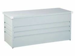 Wetterfeste, groĂźe Gartenkissenbox aus Metall in Hellgrau