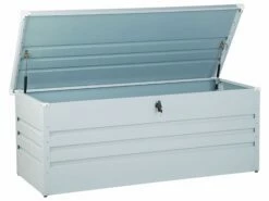 In dieser hochwertigen, robusten verzinkten Stahltruhe finden Sie genügend Platz für all Ihre Garten-, Sport- oder Campingutensilien und schützen sie über das ganze Jahr vor jeglichen Wettereinflüssen. Der stabile, glatte Deckel lässt sich mit Hilfe des Drehgriff-Zylinderschlosses verschliessen und dank einer Gasdruckfeder leicht öffnen.