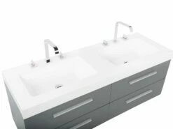 Edel. Stilvoll. Einzigartig. Das Designer Badmöbel mit zwei schönen, großen Waschbecken verwandelt Ihr Badezimmer in eine elegante Wohlfühloase. Der Hängeschrank ist aus robustem MDF mit einer Melaminbeschichtung in Grau gefertigt. Die Schubladen sind mit einem Soft-Close-System ausgestattet und bieten viel Stauraum. Die breiten Schubladengriffe aus Aluminium verstärken die moderne Ausstrahlung und das gradlinige Design dieses Sets. Die besonders pflegeleichten, großen Waschbecken aus weißem Acryl mit einer weißen Umrandung garantieren ausreichend Platz.