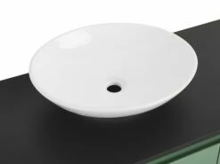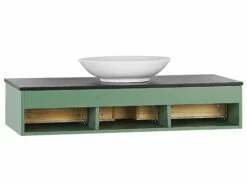Bringen Sie Funktionalität und Eleganz in Ihr Badezimmer mit diesem modernen 4-teiligen Set. Es enthält alles, was Sie brauchen: einen Hängeschrank mit Waschbecken, ein hängendes Regal und einen Spiegel. Der Unterschrank verfügt über 3 Schubladen mit Soft-Close-Funktion, in denen Schminkutensilien oder Kosmetika aufbewahrt werden können. Er ist mit einer schwarzen Platte ausgestattet, auf der sich ein rundes Waschbecken befindet, das für die Verwendung mit einer an der Wand montierten oder an der Arbeitsplatte befestigten Armatur konzipiert ist. Das Hängeregal ermöglicht es Ihnen, Ihren Platz voll auszuschöpfen. Nutzen Sie es, um Dinge darauf zu platzieren, die Sie immer griffbereit haben möchten, wie beispielsweise Handtücher oder Toilettenpapier. Der Spiegel mit schwarzem Rahmen ergänzt das gesamte Set hervorragend und verleiht ihm einen sauberen und modernen Look.