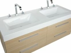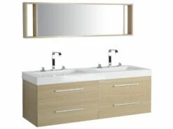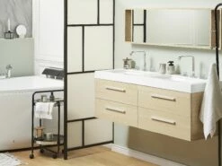 Edel. Stilvoll. Einzigartig. Das Designer Badmöbel mit zwei schönen, großen Waschbecken verwandelt Ihr Badezimmer in eine elegante Wohlfühloase. Der Hängeschrank ist aus robustem MDF mit einer Melaminbeschichtung in Beige gefertigt. Die Schubladen sind mit einem Soft-Close-System ausgestattet und bieten viel Stauraum. Die breiten Schubladengriffe aus Aluminium verstärken die moderne Ausstrahlung und das gradlinige Design dieses Sets. Die besonders pflegeleichten, großen Waschbecken aus weißem Acryl mit einer weißen Umrandung garantieren ausreichend Platz.