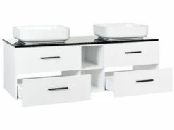 Mit seinen doppelten Waschbecken ist dieses Waschtisch-Set eine praktische Lösung für alle, die sich etwas persönlichen Raum im gemeinsamen Bad wünschen. Ein an der Wand montierter Schrank bietet vier Schubladen mit Soft-Close-System, die viel Platz für die Aufbewahrung von Kosmetikprodukten bieten. Dazwischen befinden sich offene Fächer, die zur Aufbewahrung von Handtüchern genutzt werden können. Die schwarz-weiß lackierte Oberfläche des MDF-Körpers verleiht dem Schrank einen klaren Look, der zu jedem modernen Badezimmer passt und sich hervorragend mit den weißen Keramikwaschbecken kombinieren lässt. Zum Set gehören zudem zwei LED-Spiegel, die mit einer Touchfunktion und einer Antibeschlagfunktion ausgestattet sind.