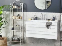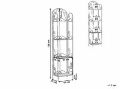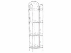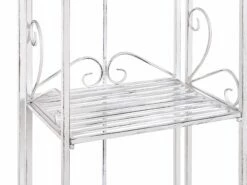 Ein praktischer Helfer, ob in der Küche, im Bad oder Eingangsbereich – dieses schmale Standregal besitzt 4 Ablageflächen, die all Ihre Gegenstände griffbereit und hübsch aufbewahren. Die leichte Konstruktion aus weißfarbenem Metall wurde mit ornamentartigen Elementen dekoriert, die dem Möbelstück einen romantischen Shabby Chic Look verleihen.