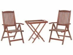Ein wunderschönes Gartentischset aus edlem Akazienholz für Ihre Terrasse, eine romantische kleine Ecke in Ihrem Garten oder auf einen Balkon! Sowohl die Stühle als auch der Tisch sind klappbar und können platzsparend weggestellt werden. Pflegeleichtes Material und eine natürliche und zeitlose Ausstrahlung überzeugen bei diesem praktischen kleinen Gartentischset.