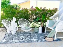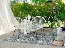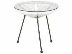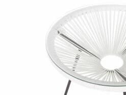 Diese Möbel sind aus einer robusten und besonders pflegeleichten Schnurbespannung aus PE Rattan in Weiß gefertigt, kombiniert mit einem stabilen, schwarzen Stahlgestell. Der Tisch bietet ausreichend Platz für Ihre sommerlichen Cocktails. Die kleine Tischplatte aus Sicherheitsglas ist mit stabilen Saugnäpfen befestigt. Das ausgefallene Design der Schnurbespannung hat einen herrlich luftigen Charakter. Die Spaghetti-Sessel sowie der Beistelltisch sind ein praktischer Begleiter für alle Innen- und Außenbereiche.