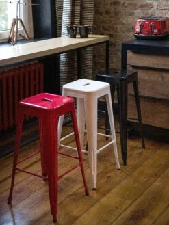 Bequem, praktisch und trendy – diese Barhocker sind richtig coole Wohnaccessoires! Modernstes Design kombiniert mit funktioneller Formgebung aus pulverbeschichtetem, pflegeleichtem Metall in glänzendem Weiß. Kunststoffnoppen schonen Ihren Fußboden und bieten einen rutschfesten Stand, und die Querstreben auf allen vier Seiten dienen als komfortable Fußstützen.