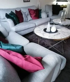 Dieser hübsche Tisch ist universell einsetzbar und kann in Ihrem Wohn- und Arbeitsbereich je nach Wunsch als Beistell- oder Couchtisch verwendet werden. Dank seiner gekreuzten, V-förmigen Füße und der runden Platte mit Marmor-Optik strahlt er eine moderne und elegante Aura aus. Die Konstruktion aus Metall gibt ihm ausreichend Stabilität und glänzt zudem in einem hübschen Silber.