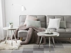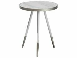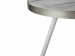 Dieser filigrane, elegante Tisch bildet die perfekte Abstellfläche für ein Blumenbouquet, eine Tischlampe oder eine eingerahmte Fotografie und verleiht jedem Innenraum einen unvergleichlichen Stil. Die Oberfläche der Tischplatte aus strapazierfähigem MDF erinnert ein weißes Marmorgestein und wird durch drei pulverbeschichtete, weiße Metallfüße mit silbernen Akzenten perfekt ergänzt.