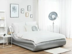 Elegantes Designerbett aus silbernem Kunstleder mit praktischem Bettkasten