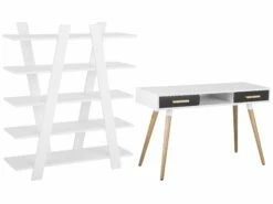 Sind Sie auf der Suche nach einem funktionalen Büroset für Ihren Wohnraum? Dieses Möbelset punktet nicht nur mit seinem skandinavischen Design, sondern auch mit seinen hochwertigen Materialien und pflegeleichten Oberflächen. Der Schreibtisch und das Regal werden mit ihrem reichen Platzangebot alle ihre Papiere, Dekoartikel und alle anderen wichtigen Dinge geordet halten und auf diese Weise Ihren Arbeitskomfort garantiert erhöhen. Der Tisch verfügt nicht nur über eine breite und robuste MDF-Tischplatte, sondern auch über Eichenholz-Beine, die Ihnen nicht nur Stabilität sondern auch genügend Beinfreiheit beim Sitzen versprechen. Zudem besitzt das Regal 5 Fächer und eine stabile Konstruktion aus qualitativer Faserplatte, die zusammen mit dem Bürotisch einen wunderschönen und robusten Look mit höchster Funktionalität in den Raum bringen.