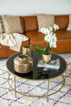 Dieser Geschmackvolle, runde Couchtisch mit einer dunklen Tischplatte aus Glas und einem goldenen Gestell verschönert jedes Interieur. Der präsentierte Kaffeetisch passt perfekt zur edlen Eleganz in Ihrem Wohnzimmer und schafft zudem einen Glamour-Effekt. Ein tolles Highlight für moderne Wohnräume!