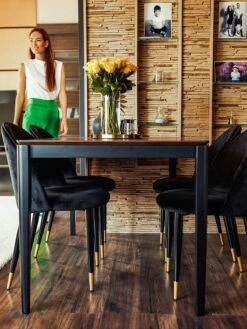 Der präsentierte Esszimmertisch beeindruckt mit einem zeitlosen Design und schlichter Eleganz. Die elegante und klassische Ausstrahlung passt zu vielen Einrichtungskonzepten und lässt sich fabelhaft mit anderen Möbelstücken kombinieren. Der Kontrast zwischen dem dunklen Holzfarbton der Tischplatte und dem schwarzen Gestell schafft einen eleganten Charme. Nehmen Sie Platz an diesen Tisch und genießen Sie lange Abende mit Ihrer Familie!