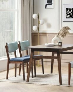 Dieses Sitzmöbel Set ist eine perfekte Verbindung des modernen Stils mit einem Retro Design. Jeder der Stühle ist aus hochwertigem Gummibaumholz gefertigt, so sind sie besonders Langlebig und Stabil. Die weichen Schaumstoffpolsterungen sorgen für einen entsprechenden Komfort. Die profilierten, mit hellblauen Stoffen gepolsterten Rückenlehnen harmonieren gut mit den dunkelblauen Sitzflächen und den dunklen Holzbeinen. Dank der armlosen Konstruktion passen die Polsterstühle gut unter jede Tischplatte.