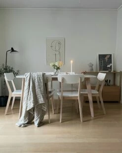 Die abgerundete Sitzfläche und Rückenlehne aus stabilem MDF in strahlendem Weiß in Verbindung mit den robusten, schlanken Stuhlbeinen aus hellem Kautschukholz geben dem Möbel eine frische, natürliche Ausstrahlung und verleihen diesem Designerstuhl seinen charakteristischen Stil. Die schmale Rückenlehne ist angenehm geformt und bietet eine bequeme Unterstützung für Ihren Rücken. Dank des feuchtigkeitsabweisenden und strapazierfähigen Materials ist diese praktische Sitzmöglichkeit sehr pflegeleicht.