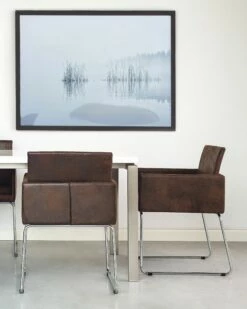 Die angenehm gepolsterten Sitzschalen der Stühle verfügen über einen hochwertigen und strapazierfähigen Bezug aus Polyester in der Farbe Dunkelbraun. Sie ruhen auf schlanken Kufen aus verchromtem Metall, die einen rutschfesten Stand bieten. Dank der perfekt geformten Armlehnen sind die Stühle so bequem wie Sessel. Sie bieten vielseitige Nutzungsmöglichkeiten für alle Wohn- und Arbeitsbereiche und machen sich in Ihrer behaglichen Essecke genau so gut wie in einem Konferenzraum.