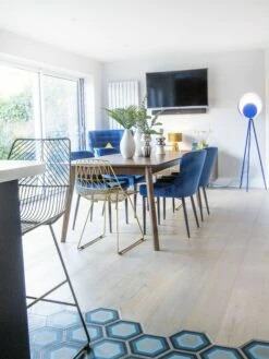 Diese herrlich bequemen Stühle begeistern durch ihr elegantes Design, ihre luxuriöse Ausstrahlung und die angenehm geschwungene Formgebung. Die rautenförmig gesteppten Bezüge aus hochwertigem Samtstoff in edlem Blau bedecken die gepolsterten Sitzflächen und die Rückenlehnen. Neben optimalem Sitzkomfort und komfortabler Polsterung punkten die Stühle mit pflegeleichtem Material und stabilem Stand.