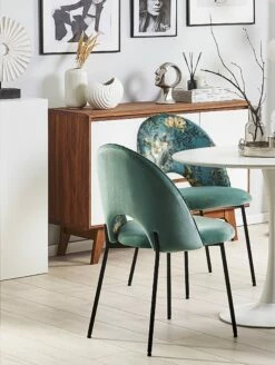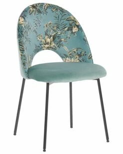Die filigranen, schwarzen Füße harmonieren wunderbar mit der weichen Samtstoff-Polsterung in modernem Grünfarbton und machen diesen Stuhl zum Designerstück schlechthin. Zudem verleiht das edle Blumenmuster der Rückenlehne einen sehr dekorativen Effekt im Raum. Dieser Stuhl kann ganz universell im Schlafzimmer neben Ihrem Schminktisch oder als Esszimmerstuhl eingesetzt werden. Er wird vor allem in romantischen und klassischen Inneneinrichtungen eine gute Figur machen und kann dabei je nach Belieben mit hellen oder dunklen Dekoaccessoires ergänzt werden.