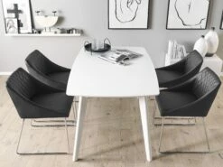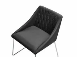 Eine angenehm gepolsterte Sitzschale mit einem strapazierfähigen, robusten Kunstleder in edlem Schwarz wird hier gekonnt kombiniert mit einem schlanken Gestell aus glänzenden, verchromten Metallkufen. Die moderne Formgebung der abgeschrägten Seiten und die klassische Steppverzierung auf der Rückenlehne verleihen diesen bequemen Stühlen eine wohnliche Optik. Dank ihrer exklusiven Ausstrahlung, dem trendy Design und ihrer perfekten Verarbeitungsqualität fügen sie sich mühelos in jeden Wohn- und Arbeitsbereich ein.