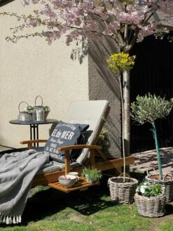 Moderne Sonnenliege aus Akazienholz mit Rädern und Auflage in Grau-beige
