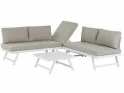Genießen Sie sonnige Momente bei bestem Komfort. Die Konstruktionen der Lounge sowie der kleine Tisch sind komplett aus Aluminium gefertigt und wirken sehr erfrischend in ihrer hellen Farbe. Der passende Couchtisch harmoniert farblich und fügt sich in das Gesamtkonzept perfekt ein. Das moderne, unkonventionelle Design wird mit zusätzlichen Sitzauflagen und Rückenkissen in Taupe ergänzt.