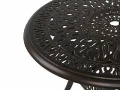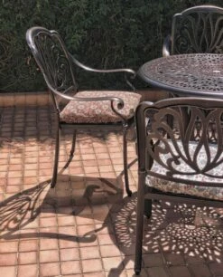 Dieses Gartenset in eleganter Boho-Optik, bestehend aus einem Tisch mit runder Tischplatte sowie 4 Stühlen ist ein Must-Have für eine gemütliche Kaffeepause auf Ihrem Balkon. Es zeichnet sich durch seine dunkelbraune, intensive Farbe, beigen Sitzkissen und das originelle Muster im Retro-Stil aus. Der ideale Begleiter für Ihren Garten sowie für kleine Flächen oder Hinterhöfe.