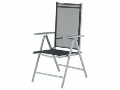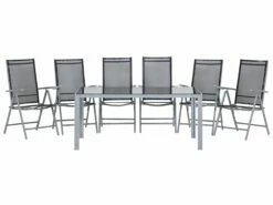 Das exklusive Set besteht aus einem hochwertigen Tisch und sechs bequemen Stühlen. Der Gartentisch wurde aus Aluminium und mit schwarzem Glas gefertigt. Raffiniert kombiniert wurden auch die Gartenstühle, die aus einem stabilen und sehr wendigem pulverbeschichtetem Aluminiumgestell bestehen, das sich zusammenklappen lässt. Für die Sitzfläche und Rückenlehne wurde robuster, witterungsbeständiger Meshstoff verwendet. Die Rückenlehne lässt sich in 5 Stufen verstellen.