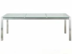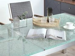 Die trendy Crushed Ice Optik der Glasplatte verleiht dem außergewöhnlichen Gartentisch eine extravagante Wirkung. Die optisch in drei Flächen aufgeteilte Glasplatte fügt sich optimal in das Edelstahlgestell ein und wird mit zwei Querstreben aus Edelstahl sicher fixiert. Die sechs modernen Gartenstühle, ebenfalls aus Edelstahl gefertigt, verfügen über Armlehnen mit einer oberen Schicht aus hochwertigem Kunstholz. Sitzflächen und Rückenlehnen sind aus einer UV-beständigen und besonders pflegeleichten Textilbespannung hergestellt und ermöglichen angenehmen und komfortablen Sitzkomfort.