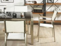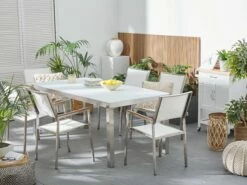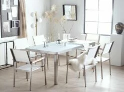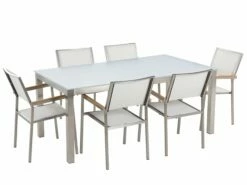 Das 7-teilige Gartenset wird das absolute Highlight auf Ihrer Terrasse sein! Das korrosionsfreie Gestell des Tischs ist aus strapazierfähigem, stabilem und gebürstetem Edelstahl gefertigt und hat einen rutschfesten Stand. Die Tischplatte aus Sicherheitsglas in wunderschönem Weiß verfügt über flache Kanten und abgeschliffene Ecken. Die sechs modernen Gartenstühle, ebenfalls aus Edelstahl gefertigt, verfügen über Armlehnen mit einer oberen Schicht aus hochwertigem Kunstholz. Sitzflächen und Rückenlehnen sind aus einer UV-beständigen und besonders pflegeleichten Textilbespannung in der Farbe Weiß hergestellt und ermöglichen angenehmen und komfortablen Sitzkomfort.
