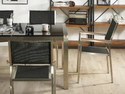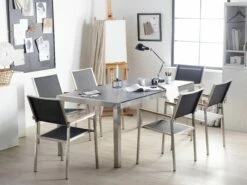 Das exquisite Tischset aus wertvollem Edelstahl und Naturstein ist ein ganz besonderes Modell in unserer Produktepallette. Die Materialien der Tischplatte bilden ein Zusammenspiel, welches an Robustheit und Eleganz kaum zu übertreffen ist. Der glänzende Rahmen aus gebürstetem Edelstahl ist äußerst stabil und wasserfest. Die schwarze geflammte Steinplatte ist extrem witterungsbeständig und perfekt verarbeitet, so bildet sie eine unverwüstliche Tischoberfläche. Die sechs designer Stühle mit dem standfesten Gestell und erstklassiger UV- beständiger Textilsitzfläche in Schwarz harmonieren perfekt mit dem robusten Tisch.