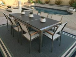 Das exquisite Tischset aus wertvollem Edelstahl und Naturstein ist ein ganz besonderes Modell in unserer Produktepallette. Die Materialien der Tischplatte bilden ein Zusammenspiel, welches an Robustheit und Eleganz kaum zu übertreffen ist. Der glänzende Rahmen aus gebürstetem Edelstahl ist äußerst stabil und wasserfest. Die schwarze geflammte Steinplatte ist extrem witterungsbeständig und perfekt verarbeitet, so bildet sie eine unverwüstliche Tischoberfläche. Die acht designer Stühle mit dem standfesten Gestell und erstklassiger UV- beständiger Textilsitzfläche in Weiß harmonieren perfekt mit dem robusten Tisch.