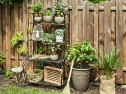 Dekoratives, schwarzes Pflanzenregal im ansprechenden Shabby Chic Look