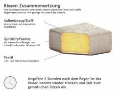 Längerer Kontakt mit Wasser kann zu Verfärbungen und Verformungen führen. Um die Haltbarkeit der Möbel zu verlängern, wird empfohlen, bei ungünstigen Witterungsbedingungen eine Schutzabdeckung zu verwenden.