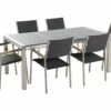 Das Gartenstuhl Set ist ein sehr handliches Modell, welches aus edlen, witterungsbeständigen und raffiniert miteinander kombinierten Materialien gefertigt wurde. Das starke und robuste Edelstahlgestell verfügt über zwei Armlehnen aus Kunststoff. Sitzfläche und Rückenlehne sind aus einer Textilbespannung in der Farbe Grau hergestellt und ermöglichen somit ein angenehmes und komfortables Sitzen.