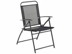 Die Klappstühle mit breiten Armlehnen lassen sich schnell heran holen, wenn Sie bei einer größeren Runde noch zusätzliche Sitzmöglichkeiten benötigen. Sie sind platzsparend zusammenklappbar und können somit auch wunderbar mit in den Urlaub, an den Strand oder zu einem Picknick. Dieses flexible Set ist aus robustem, pulverbeschichtetem, schwarzem Stahl gefertigt mit einer Bespannung aus schwarzem Textilene.