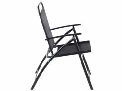 Die Klappstühle mit breiten Armlehnen lassen sich schnell heran holen, wenn Sie bei einer größeren Runde noch zusätzliche Sitzmöglichkeiten benötigen. Sie sind platzsparend zusammenklappbar und können somit auch wunderbar mit in den Urlaub, an den Strand oder zu einem Picknick. Dieses flexible Set ist aus robustem, pulverbeschichtetem, schwarzem Stahl gefertigt mit einer Bespannung aus schwarzem Polyester.