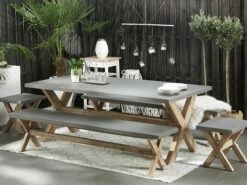 Verschönern Sie Ihren Garten mit diesem Tisch, der das Beisammensein unter Verwandten und Freunden so viel einfacher macht! Die Faserzement gefertigte Tischplatte mit rustikalem Gestell aus massivem Akazienholz ist pflegeleicht, beständig gegenüber natürlichen Witterungseinflüssen und somit perfekt für den Außenbereich geeignet. Die Holzbeine gewährleisten die Stabilität der Konstruktion und sorgen in Kombination mit der großzügigen Tischplatte für einen auffälligen Akzent in Ihrem Gartenbereich.