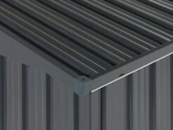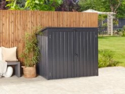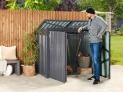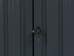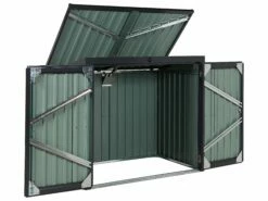 Moderner, abschließbarer Geräteschuppen aus Metall mit 2 großen Türen und hochklappbarem Pultdach