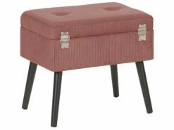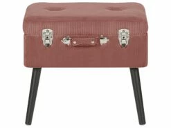 Dieser vom Vintage Stil inspirierte Hocker ist in rosa Cord gepolstert und verfügt über dekorative Knöpfe, glänzende silberne Klappverschlüsse und einen stilvollen Griff. Er kann so wie ein echter Koffer geöffnet werden und bietet reichlich Stauraum für alle Kleinigkeiten. Seine schlanken, eleganten Beine verleihen ihm einen minimalistischen Touch.