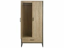 Dieser Schrank ist ein eklektisches Möbelstück, das sowohl zum skandinavischen als auch zum industriellen Einrichtungsstil passt. Im Hauptfach befindet sich eine Kleiderstange für Kleiderbügel und darunter viel Platz für gefaltete Kleidung. Eine Schublade am unteren Ende des Möbels ist nützlich, um Unterwäsche oder Socken aufzubewahren. Die gesamte Konstruktion ruht auf einem Metallrahmen, der für Stabilität und Festigkeit sorgt.
