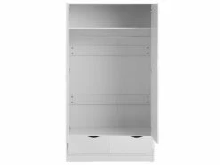 Ein minimalistischer Kleiderschrank mit vielen Funktionen ist in jedem Schlafzimmer notwendig. Hinter zwei Türen befindet sich ein Fach mit einer Kleiderstange für Kleiderbügel und ein geräumiges Regal für gefaltete Kleidung. Außerdem ist der Kleiderschrank mit zwei tiefen Schubladen ausgestattet, in denen Sie Ihre Unterwäsche oder Socken unterbringen können. Dank des robusten Holzwerkstoffs und der grifflosen Konstruktion wird der Schrank jahrelang im Einsatz bleiben.