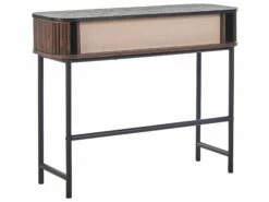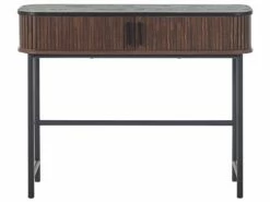 Organisieren Sie Ihren Raum mit diesem Konsolentisch, der über 2 Schiebetüren verfügt. Dahinter befindet sich ein geräumiger Stauraum, den Sie nutzen können, um Kleinigkeiten oder Bücher zu verstecken. Der Tisch punktet mit einer langlebigen, gut durchdachten Metallkonstruktion sowie mit seinen pflegeleichten Oberflächen in einer angesagten Holzoptik.