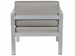 Das stabile Gestell ist aus rostfreiem, eloxiertem Aluminium gefertigt und sowohl das Sofa wie auch die Sessel sind mit bequemen Sitzpolstern und weichen Rückenkissen ausgestattet. Die grauen Bezüge aus hochwertigem Polyester sind dank ihrer schmutz- und feuchtigkeitsabweisenden Beschichtung besonders pflegeleicht. Sie sind abziehbar und waschbar. Der Loungetisch ist aus eloxiertem Aluminium mit einer stabilen Tischplatte aus hochwertigem Kunstholz gefertigt. Bei starker Sonneneinstrahlung sollte kein Glasgeschirr direkt mit der Oberfläche in Berührung kommen.