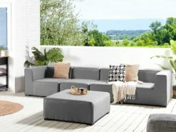 Ein modernes Design, Komfort und Funktionalität, so lässt sich dieses Gartensofa Set perfekt beschreiben. Sie können alle Sitzelemente jedoch auch alle als alleinstehende Stücke platzieren und so die Aufstellung flexibel, individuell und ganz nach Bedarf an Ihre räumlichen Gegebenheiten anpassen. Das stabile, schwarze Untergetell ist aus pulverbeschichtetem Metall gefertigt. Die Gartenmöbel sind im Inneren mit einem schnelltrocknenden Schaumstoff gepolstert, welcher Waßer dank seiner speziellen Struktur wesentlich schneller durchlaufen lässt als hochelastische Schaumstoffe.