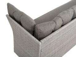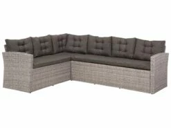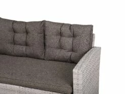 Zeitlose Eleganz für lange Sommerabende mit Familie und Freunden. Dieses robuste und zugleich gemütliche Lounge Set aus grauem Polyrattan ist witterungs- und strapazierfähig und schafft dank der großen Eckcouch und der praktischen Sitzbank genug Platz für bis zu 8 Personen. Der geräumige und etwas höhere Tisch dient nicht nur als Abstellfläche für Getränke, sondern eignet sich perfekt als Esstisch.