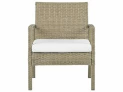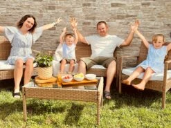 Das moderne Gartenset bietet eine Sitzgelegenheit für 4 Personen und besteht aus einer komfortablen, 2-sitzigen Gartenbank, 2 einzelnen Gartenstühlen und einem niedrigen Gartentisch. Das Loungeset ist aus hochwertigem Polyrattan in Hellbraun gefertigt. Das Polyrattangeflecht ist sehr widerstandsfähig und UV-beständig. Das pflegeleichte, strapazierfähige und unempfindliche Material ist insbesondere für den langfristigen Aufenthalt im Freien bestens konzipiert. Das Gestell aus pulverbeschichtetem Stahl garantiert höchste Stabilität. Die bequemen Sitzkissen mit einer dicken Polsterung bieten höchsten Sitzkomfort. Urlaubsfeeling wie in Italien. Genießen auch Sie Sommer, Sonne und Entspannung in Ihrem Garten oder auf der Terrasse mit diesem gemütlichen Loungeset.