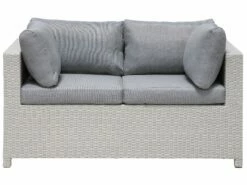 Gemütliches Gartenset aus hellgrauem Polyrattan mit grauen Polstern und Kissen