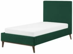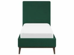 Dieses moderne Bett ist ideal für jedes Schlafzimmer – es schafft eine perfekte Balance zwischen Eleganz und Schlichtheit. Das gesteppte Kopfteil in rechteckiger Form sowie die Seiten des Betts sind mit einem weichen, pflegeleichten Samtstoff in Dunkelgrün versehen. Die Holzkonstruktion sorgt für Stabilität, während die stilvollen Beine aus dunklem Holz das Gesamtkonzept wunderbar ausgleichen.